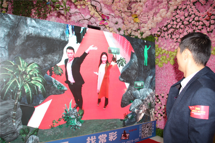 At the entrance of the conference hall, Jiangsu bright color electronic display of the hottest LED+3D+AR technology, through the big screen and human interaction, many participants in the side of the crowd, also want to experience a.