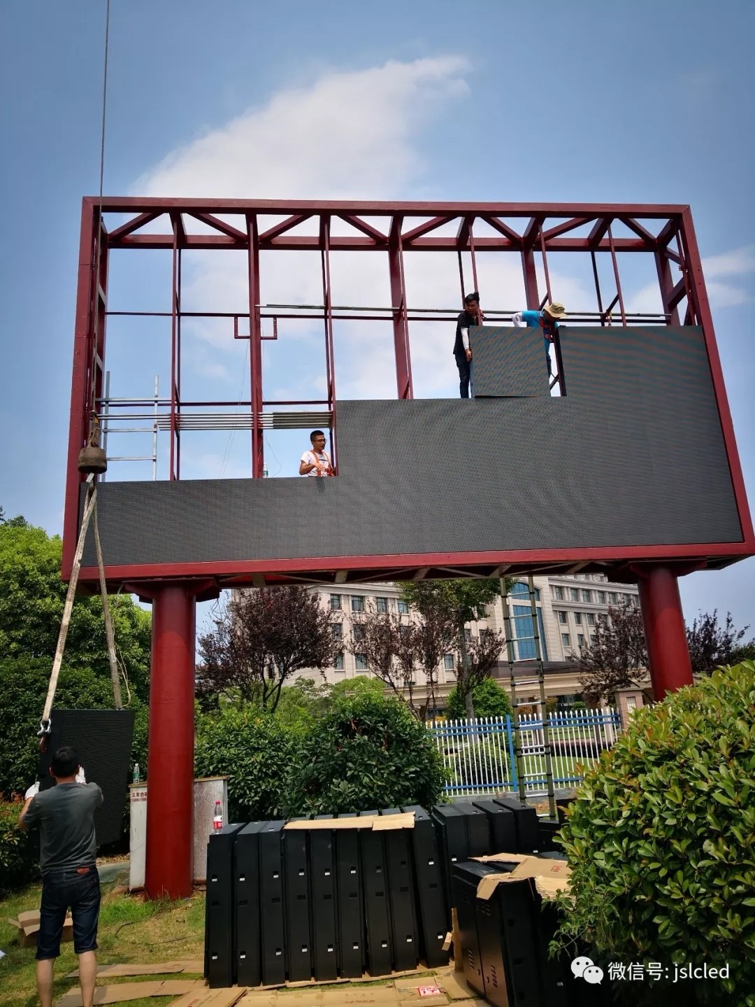 該項目由江蘇亮彩承制,負責該項目的鋼架結構設計施工以及LED顯示屏顯示系統的整體構建。正值盛夏,亮彩工程部也一絲不茍的完成的戶外顯示屏安裝工作,江蘇亮彩團隊始終不斷提升產品卓越性,完善售后服務以保障完美交付每一項顯示屏安裝工程。